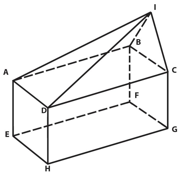 A solid is shown in the figure below. The vertices ABCDEFGH form a 4 cm × 2 cm × 2 cm cuboid. The segments AI and DI are both of length 5 cm, and points ICGFB are coplanar. What is the height (in cm) of point I from the base rectangle EFGH?