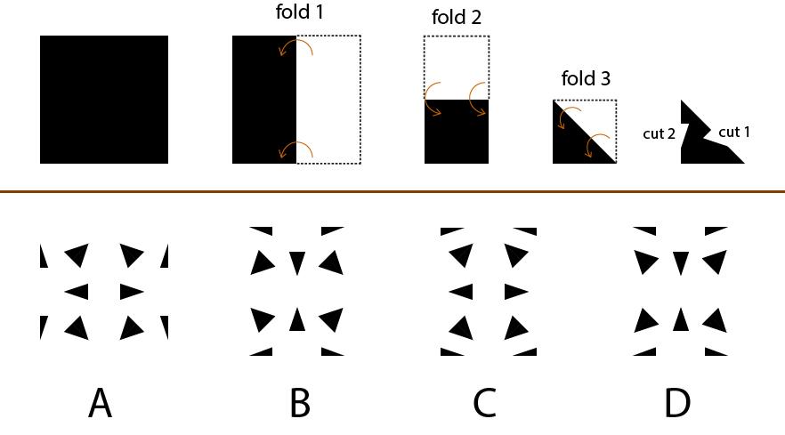 A square paper is folded and cut as shown below. The paper is then used as a template to spray-paint a white wall with black paint. Which pattern would be created using this template?