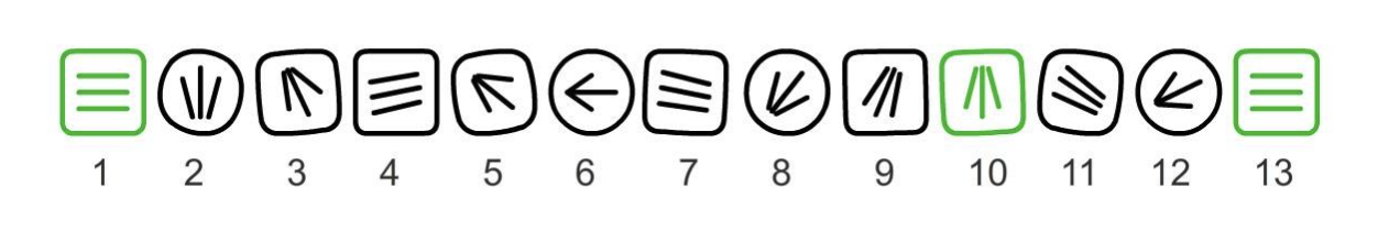 A micro-interaction has been designed for a 'menu' icon. On clicking this icon, it changes into a different icon representing 'back', depicted by an arrow. On another click it changes back to the menu icon. Shown below are 13 key-frames of this animation. Their order is incorrect, but the ones in green are in the correct position. Identify the correct order of this animation.