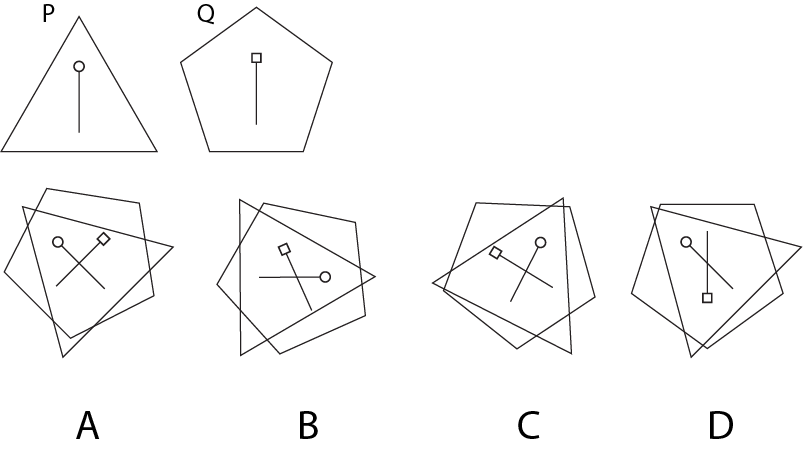 Triangle P and pentagon Q have markings on them as shown in the figure. If they are placed over each other, which of the following arrangements is/are possible?
