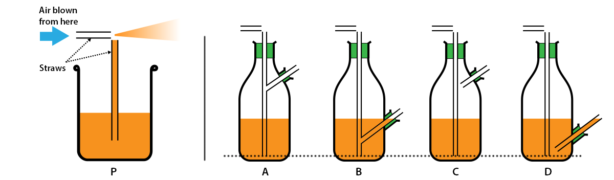 P shows a basic schematic of how an airbrush works. In the options, the green sections are seals. Of these options, which of the design concepts of an airbrush will work continuously until the liquid in the container is exhausted up to the dotted line?