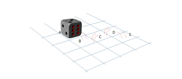 A dice is rolled from its current position (A) through B, C and D to stop at position E. What will be the number on the top of the dice at position E, if each pair of its opposite faces adds to seven?