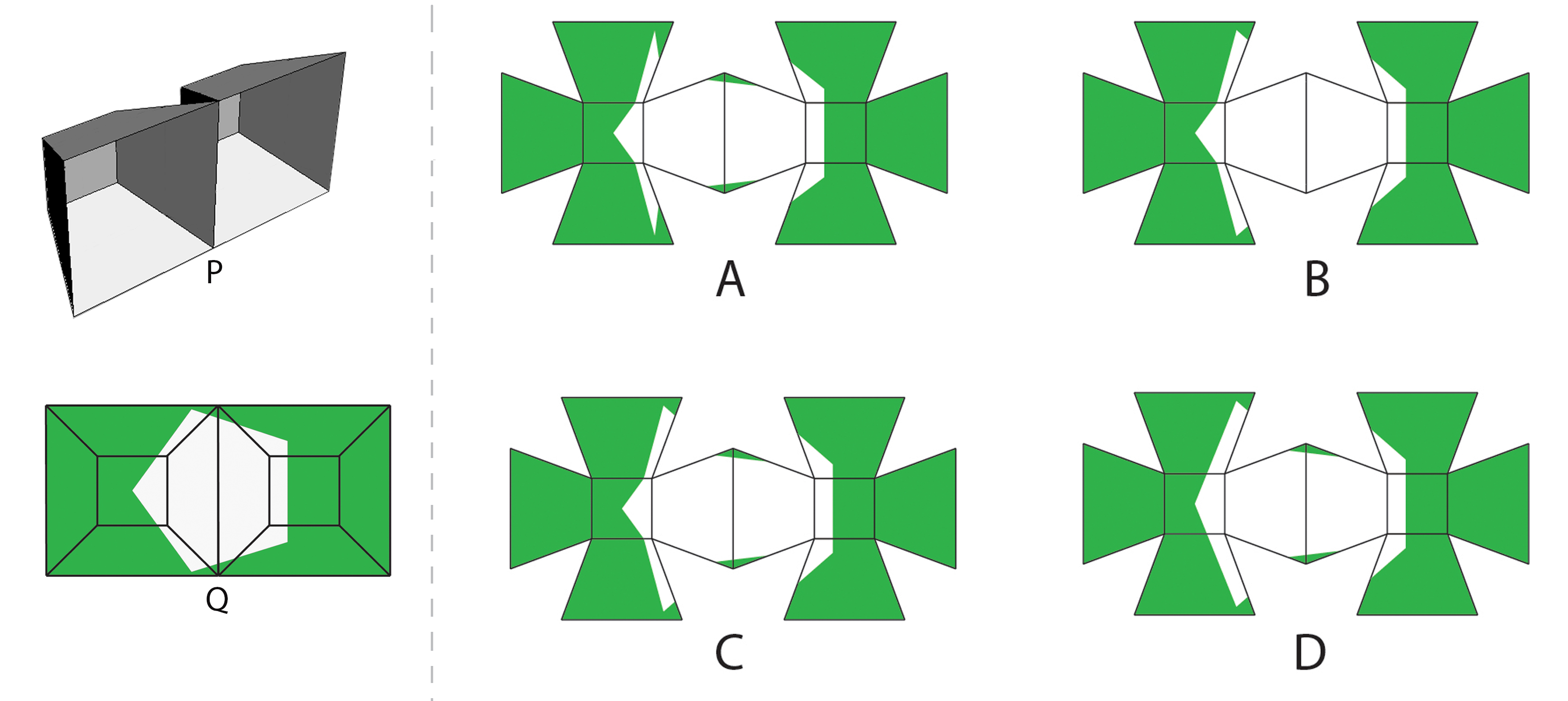 Figure P shows an isometric view of an object made with a single sheet of cardboard. Figure Q shows the front view of the same object after colouring. Which option shows the object after it is cut open?
