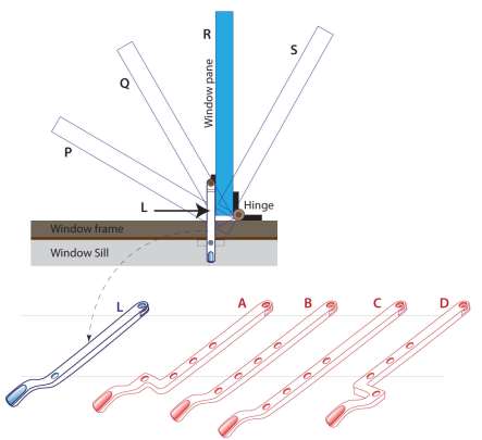 An open window is shown in top view. It has a locking lever L which holds the window pane at only position R. Which locking lever out of the given options will make it possible to hold the window pane at position P, Q, R and S?