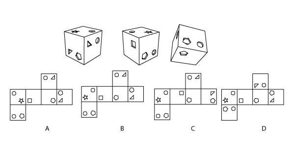 The image shows different views of a cube made out of panels with cut-outs. Which option can be folded to make the given cube?