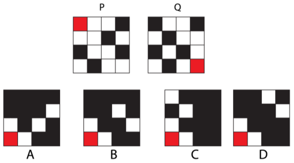 P and Q are two grids, in which white squares are transparent. P is rotated 90 degrees counter-clockwise and Q is rotated 90 degrees clockwise. What would be the resulting figure if the rotated grids are overlapped?