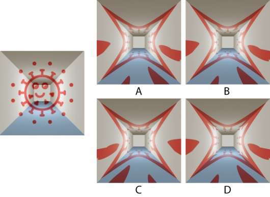 An artwork drawn on the walls, ceiling and floor of a long corridor, when viewed from a specific angle, creates an illusion as shown in the image on the left. Which option correctly depicts this artwork as seen from the opposite side of the corridor?