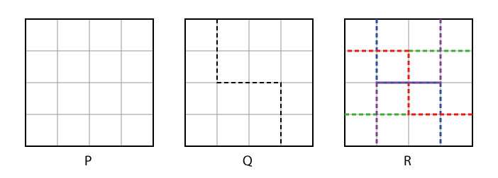 Figure P shows a square tile with a 4×4 grid marked on it. One of the ways the tile can be cut along the grid lines into two similar and contiguous pieces is shown in figure Q. The different configurations of this cut, shown in figure R, are counted as the same cut. In how many ways, excluding the cut shown in Q, can the tile be cut into two similar and contiguous pieces along the grid lines?