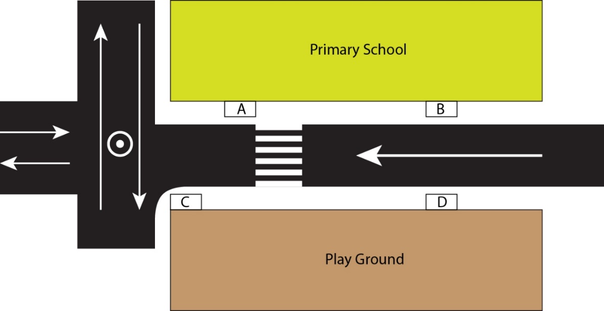 Figure shows the plan of a one-way road passing next to a primary school. Which of the options can be the location(s) to set up a bus stop for the school bus in Indian context?