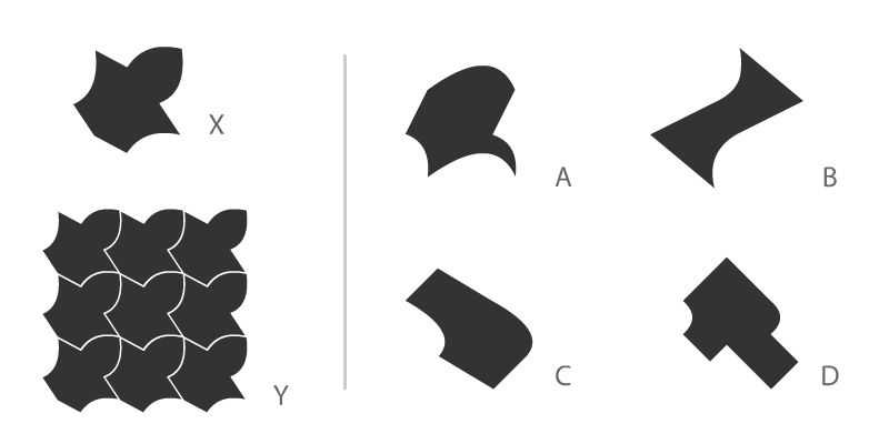 Tile X was used to create a pattern which is seamless (without gaps) when arranged as shown in Y. Which tile(s) from the options will create a seamless pattern?