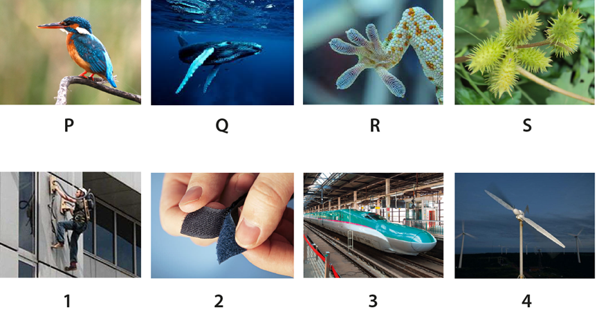 Biomimicry is the practice of looking to nature for inspiration to solve design problems. Shown below are plants and animals (top row: P, Q, R, S) that have inspired the design of products (bottom row: 1, 2, 3, 4). Which of the options listed below correctly identifies the plant and/or animal with the product that it inspired?