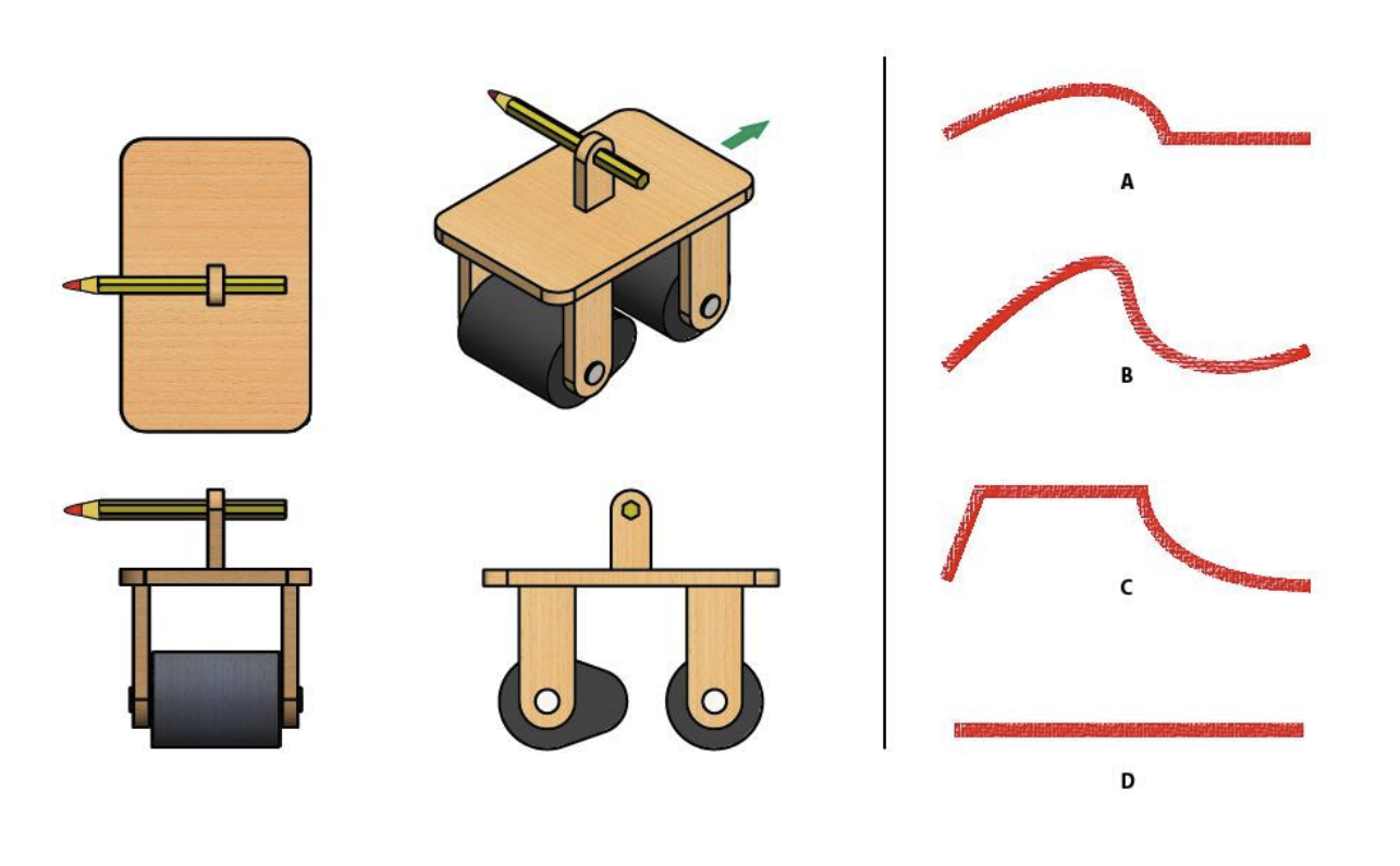The toy shown in the figure is pushed in the direction of the green arrow as the pencil makes a mark on a wall beside it. Which of the mark(s) in the options can NEVER be made by the pencil?