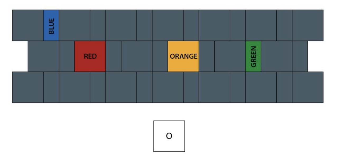 Shown below is a keyboard designed for smartphones. It has two sizes of keys which are arranged one after the other. What will be the difficulty of independently typing a single coloured key from the origin (key O), arranged from least difficult to most difficult i.e. easiest to type first, most difficult to type last. Assume, the mobile is held vertically in the left hand, and a right-handed user presses the keys using only the index finger of the right hand.