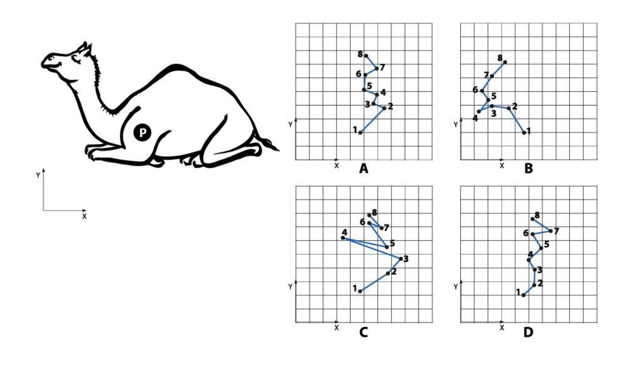 A camel is resting under the shade of a tree. Camel needs to stand-up to walk. Trace the trajectory of point P shown on the body of the camel, as it stands up, assuming 1 as the starting point.