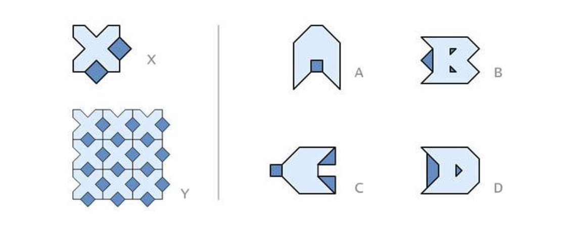 Tile X was used to create a pattern which is seamless (without gaps and/or overlaps) when arranged as shown in Y. In a similar manner, which tile(s) from the options will create another seamless pattern?