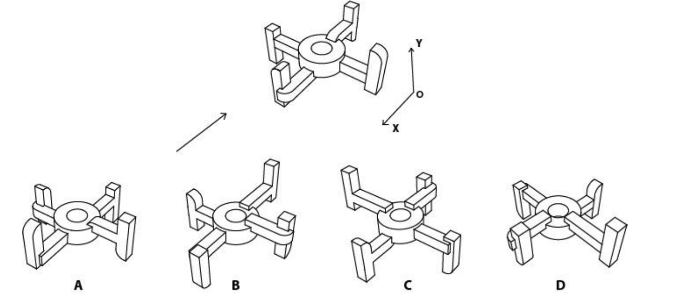 Shown below is the perspective view of an object when viewed from the direction of the arrow. The object is first rotated by 90 degrees clockwise about the y-axis, then 180 degrees anti-clockwise about the x-axis, followed by 90 degrees anti-clockwise about the y-axis. All rotations are as viewed from a point on the positive axis towards the origin of the respective axes. Which option shows the CORRECT resultant view?