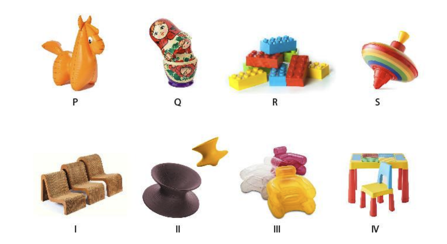Sets of Toys and Furniture are shown below. Which option correctly matches the furniture and toys, based on similar product features?