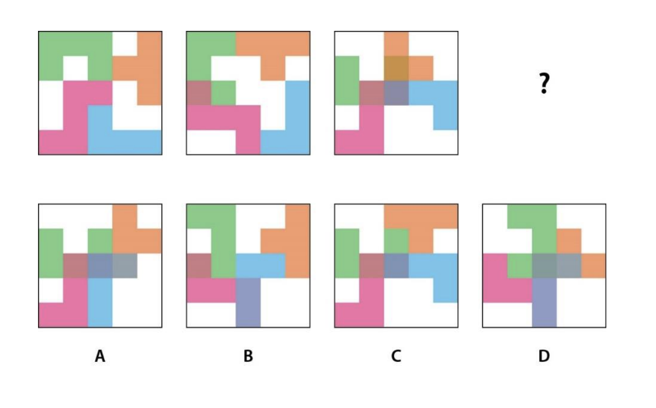 Q32.Several magnetic and non-magnetic bars of equal dimensions are glued together as shown on the left. If blue denotes magnetic north, red denotes magnetic south and grey denotes non-magnetic material, what will be the configuration of the faces on the other end?
