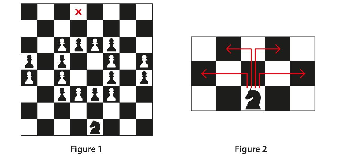 Shown below in figure 1 is a layout of a chess board with one knight and several pawns. Given that the knight cannot land on any square that has a pawn, but can jump over it, the pawns cannot move, and the knight moves on a chess board as shown in figure 2, what is the least number of steps required for the knight to reach square x?