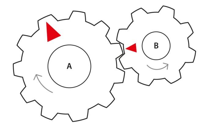 Two gears A and B with red arrows are shown below. Gear A rotates in clockwise direction. How many complete rotations does the gear B have to make for the red arrows to meet?