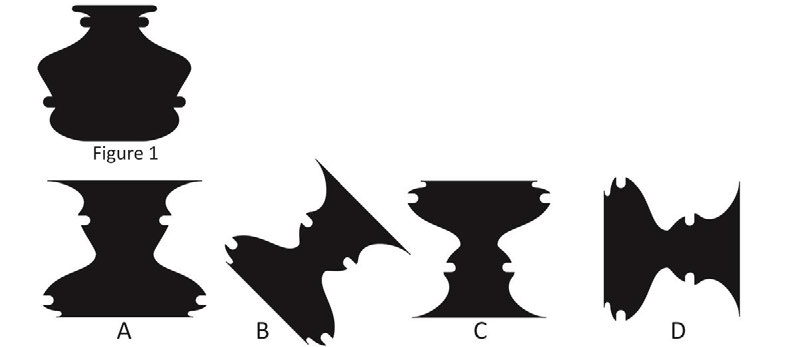 Q54.The object shown below is rotated by 180 degrees about the X axis in the anticlockwise direction as seen from the top. Identify the trail left by the orange blobs when seen from the top.