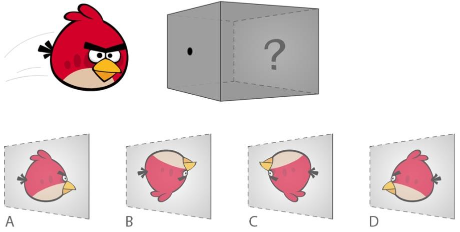 An angry bird is flying in front of a pin-hole camera as seen in the picture below. If it flies back in the opposite direction, what would be the image cast on the inner wall of the camera?