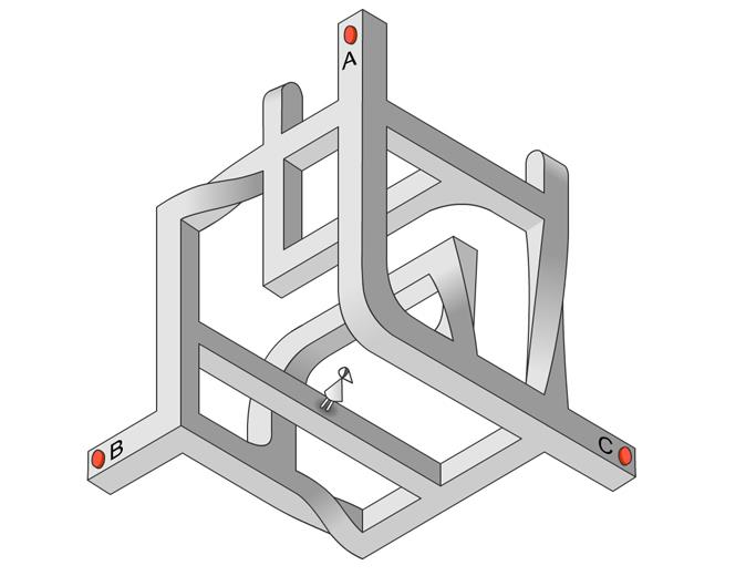Ida is standing on the structure as shown below. She wants to reach points A, B or C, but she can only travel on a continuous surface. Which of the following statements is true?