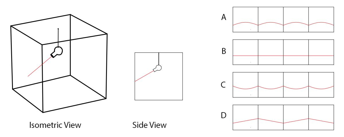 A light source is attached to a rod fixed in the centre of the ceiling of a square room. This source rotates 360 degrees with the rod as its axis. This source projects a red beam of light onto the four walls of the room. This setup is shown in the isometric view and the side view in the figure below. Identify the correct path of the beam of light on the four walls of the room.