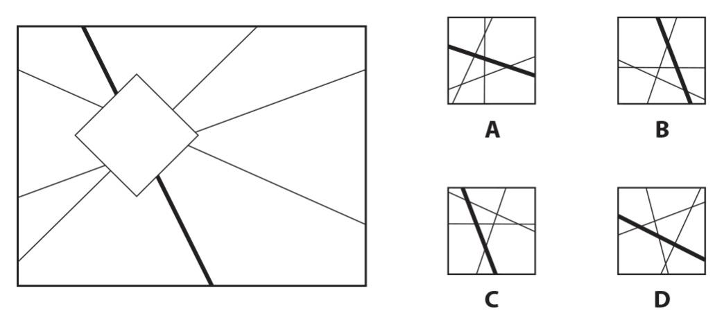 Shown below is an image with straight lines, in which, a tilted-square has been cut out. From the given options identify the missing cut out of the square that completes the original image.