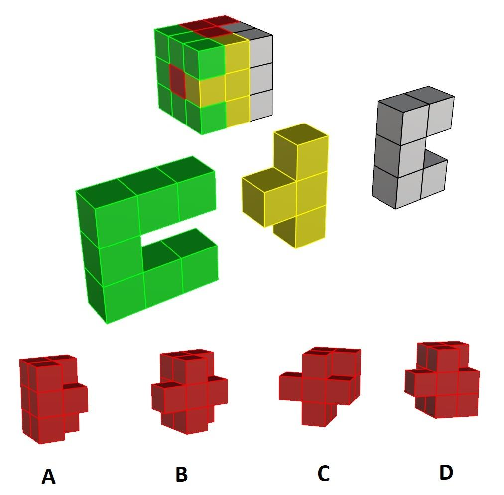 The figure below shows a 3 × 3 cube with 4 colours. The same coloured shapes are detached and shown separately for reference. Identify the shape of the red block from the given options.