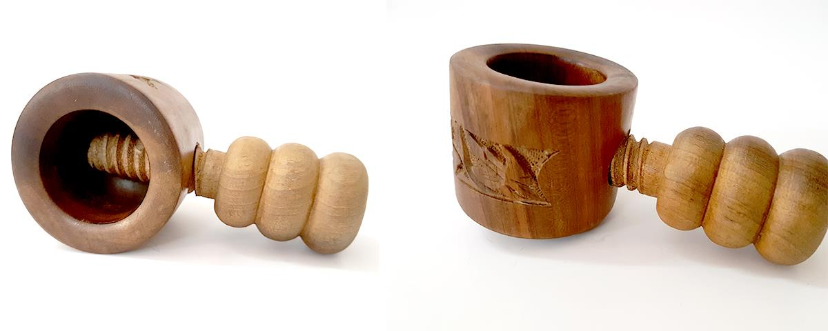 Refer to the following image of a wooden product and read the statements below. 1. It has provision for cracking nuts, and it has a good grip. 2. It has a good grip, and it has provision for opening cans as well as cracking nuts. 3. It has provision for a grinding nuts, and its making involves drilling, twisting, and casting. 4. Its making involves drilling, turning, and twisting. Which of the following options is correct?