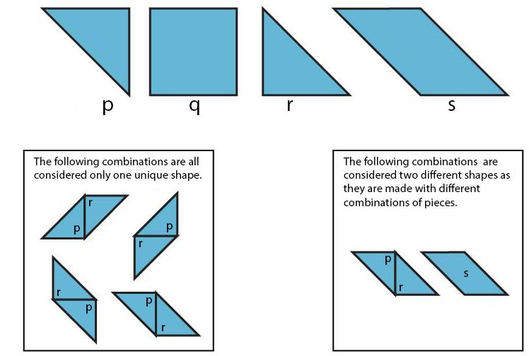 Four cut-outs of shapes (labelled p, q, r, s) are shown below. Using one or more of the cut-out pieces, how many unique combinations can be made that will create a square/rectangle?
