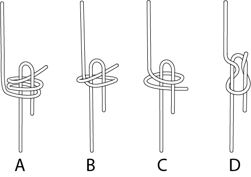 The figures show four different schematics of two flexible strings. If all the ends are pulled tight, which of the options will form a knot?