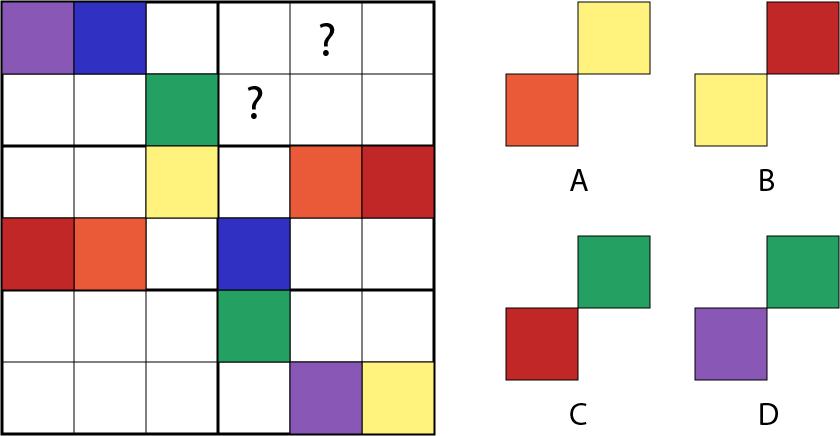 The adjacent figure has six compartments. Each compartment consists of six squares. These squares are to be filled with six different colours in such a way that each row, each column and each compartment should have all six colours. Which of the options will replace the question marks?