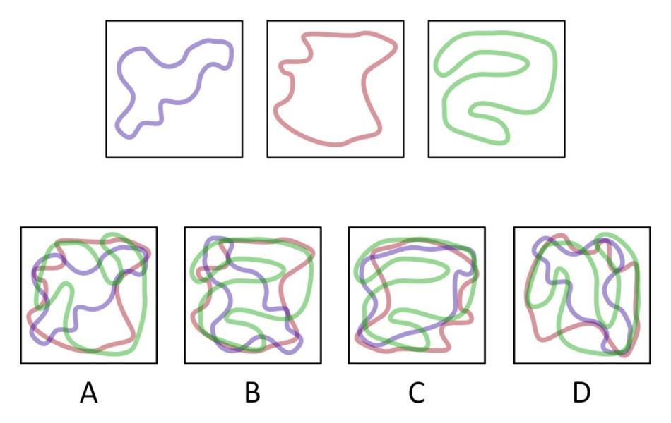 Three squiggles were drawn on three transparent square sheets in semi-transparent ink and piled together. Some sheets may be rotated. Additionally, in some options, some squiggles are different than the ones shown. In which option(s), do the squiggles look different?