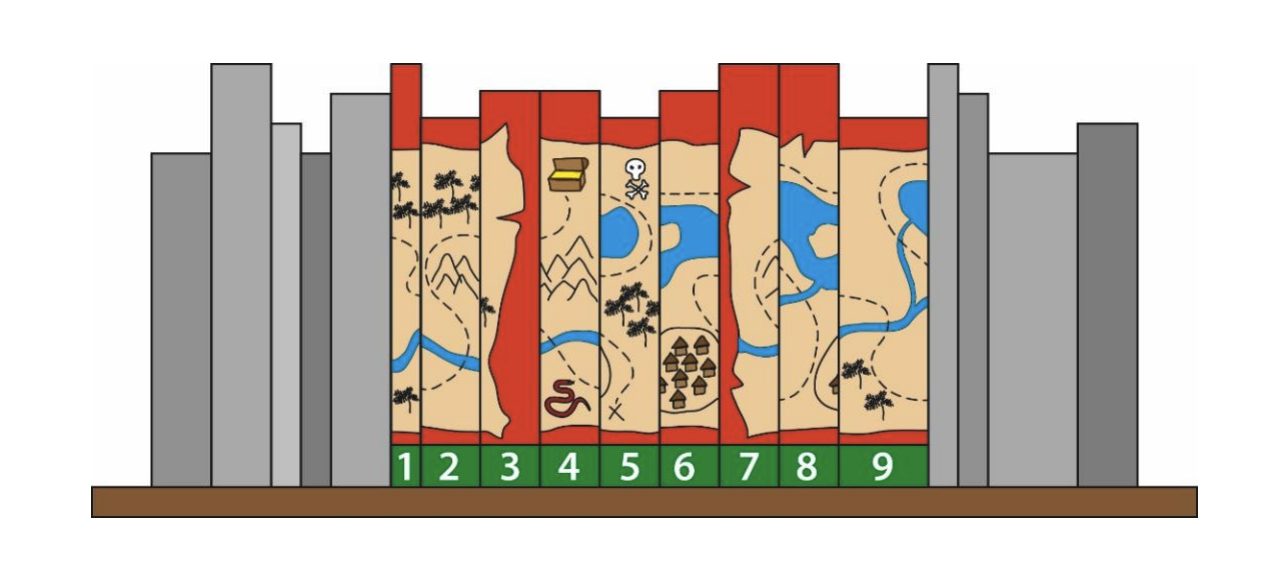 Shown below is a book shelf that has a kid's adventure novel in a book series of 9 volumes. The spines (binding side) of these books contain parts of a treasure map. What is the sequence of the books that forms the completed treasure map? Enter the answer as a single nine-digit integer.