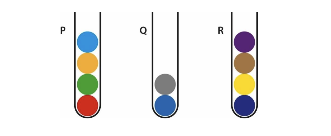 Shown below are three tubes P, Q and R with coloured marbles. Each tube can hold a maximum of 5 marbles. Only one marble can be transferred in a move. What is the minimum number of moves required to transfer the red marble from tube 'P' to the bottom of tube 'R'?