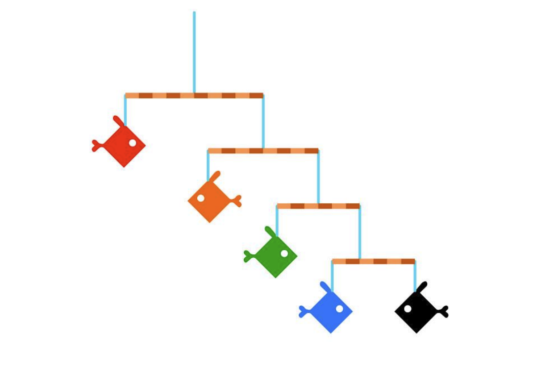 The image shows a hanging sculpture created by tying fish-shaped cutouts of different weights by blue strings on brown sticks, as shown. The sticks and strings have negligible weight. The sculpture remains balanced after it is suspended from a ceiling. If the weight of the black fish is 5 grams, what is the weight (in grams) of the red fish?