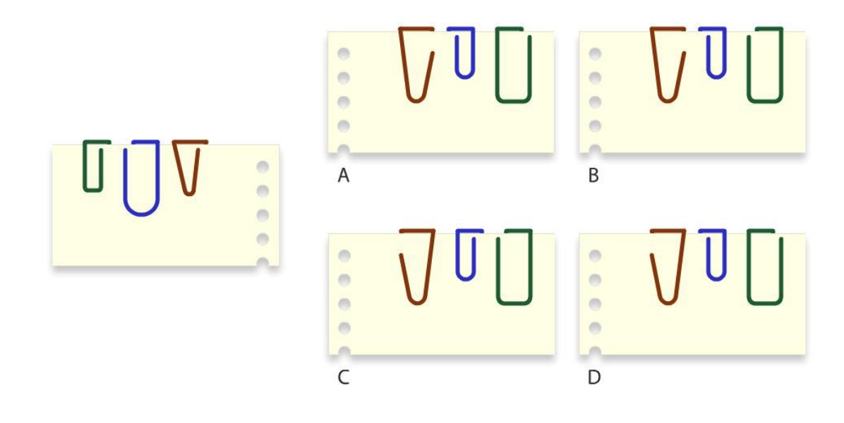 Three paper clips are attached to a paper as shown on the left. Which of the options shows the back side of the paper?