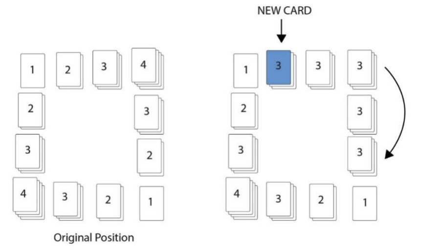 A game board was set with multiple decks of cards arranged in such a way that sum total of the cards on each side was equal (1+2+3+4=10). However, a new card was added on one side (blue card) and the cards were rearranged to maintain the rule, namely, that the sum total equals 10. How many cards can be added (starting from original position as shown on the left) before the game ends and no more cards can be added? Assume that every position must have at least one card and the sum total rule of 10 must be followed.