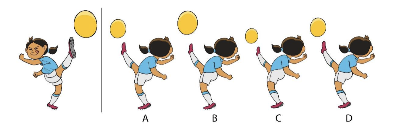 Fatima is shown kicking the football. Identify the most appropriate illustration of the scene observed from behind.