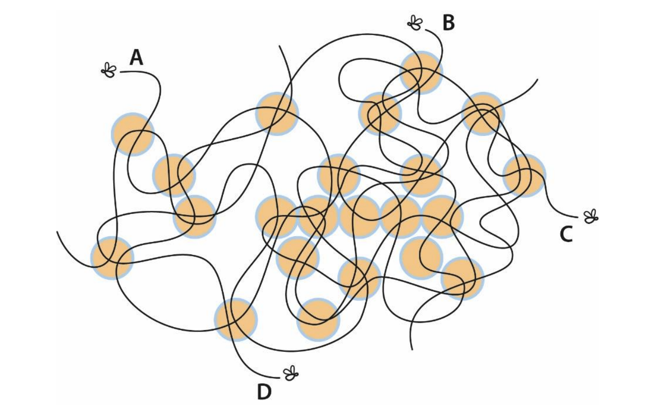 Shown below are trajectories of 4 flies over the juice glasses. Identify the fly that crossed over the maximum number of glasses.