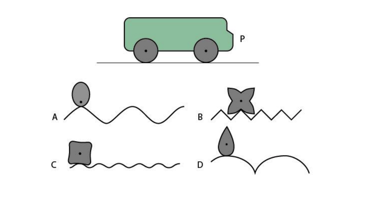 Figure P shows a profile of a bus with circular wheels on a flat road. The options below show profiles of 4 wheels and corresponding roads. If the 'wheel' always moves without slipping or sliding, which of the options will result in the bumpiest ride?