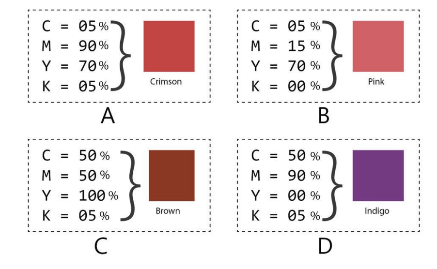 ![A printer wishes to print four colours, Crimson, Pink, Brown, and Indigo, using CMYK [Cyan, Magenta, Yellow and Key (black)] inks. The printer uses the CMYK combinations shown below (in % of each ink) to produce the colours on the right. Which combination(s) will result in the correct colour(s)?](/images/questions/uceed/2023/A220.png)