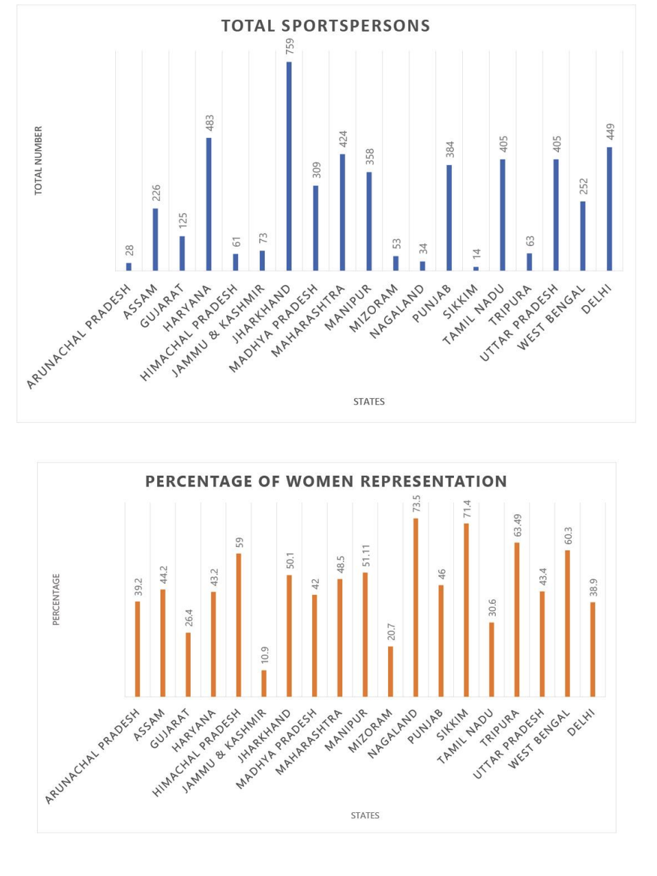 Two bar charts are shown — one showing Total Sportspersons by state and one showing Percentage of Women Representation by state. Which of the statement(s) is/are true? A. Jharkhand has the highest number of sportspersons but its percentage of women representation is not the highest. B. Of all the North-Eastern states, Nagaland produces the highest number of sportspersons. C. Jammu & Kashmir has low number of sportspersons but high women's representation. D. Even though Tamil Nadu and Uttar Pradesh have the same number of sportspersons, Uttar Pradesh fares higher in women's representation as compared to Tamil Nadu.