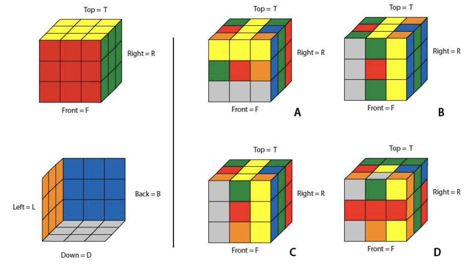The faces of a solved Rubik's Cube are shown in the figure. A 90 degree clockwise turn of a face T is denoted as 'T+' and 90 degree anticlockwise rotation is denoted as 'T–'. What is the result of the operation T+, D+, R-, L-? All operations are done looking directly at the face.