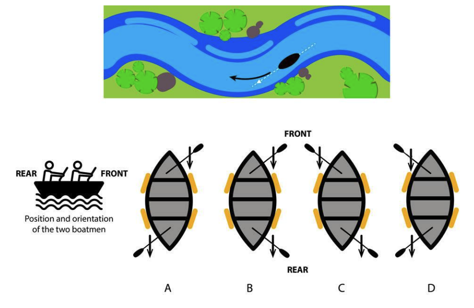 A boat is moving on the river and following the path as shown by the dashed line. Both the boatmen are facing front and rafting with equal force in the directions shown by the arrows in the options. Which of the options will help the boat to take a right turn?