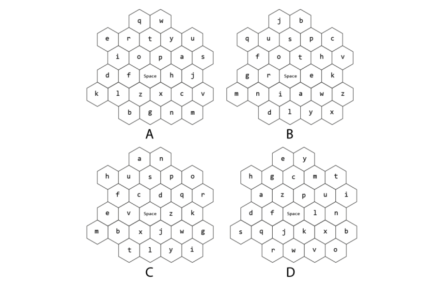 Four keyboard layouts were designed to enter text on touch-screen mobile phones. Which of these layouts has the shortest finger travel distance for entering text in the English language? Assume, the mobile is held vertically in the left hand, and a right-handed user presses the keys using only the index finger of the right hand.
