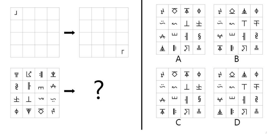 A matrix of symbols is shown with a transformation applied (indicated by an arrow). A second matrix of symbols is shown with the same transformation applied. Which option correctly shows the result of the second transformation?