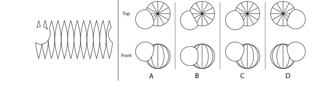 Given on the left is the unwrapped surface of a hollow sphere that was intersected by a smaller solid sphere. Which of the options would result in this unwrapped surface?
